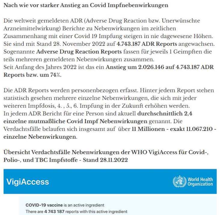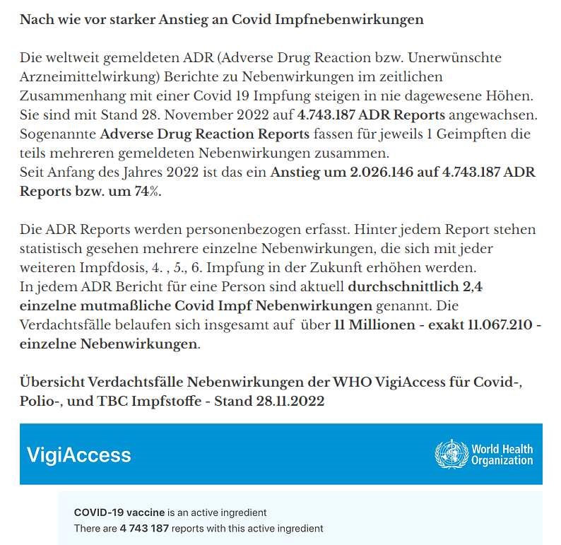 »Seit nunmehr 3 Jahren warne ich hier unermüdlich vor den experimentellen mRNA Impfstoffen (Gentherapie), mittlerweile ist medizinisch und zellbiologisch völlig zweifelsfrei bewiesen, dass die nanogenetischen Covid - Injektionen neben vielen teilweise schwersten Nebenwirkungen wie z.B. Myokarditis und Schlaganfall auch V-AIDS erzeugen können und die multiplen immunsuppressiven Wirkungen der «Impfung» sogar Krebs bewirken können, was den drastischen Anstieg vieler Krebsarten seit der Impfkampagne erklärt.