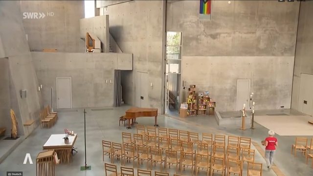 Kath. Kirche Raum Freiburg mit Regenbogen Flagge und Maria 2.0 Aktivistin